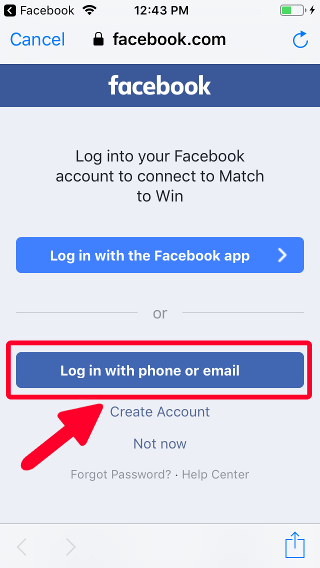 If you seem to be stuck in a loop when trying to login via Facebook with either Match to Win or Lucky Match, try pressing the "Log in with phone or email" button as shown below. If you have tried this and are still not successful, please contact us and we'll try troubleshooting the issue with you.